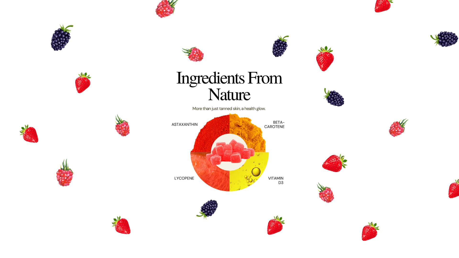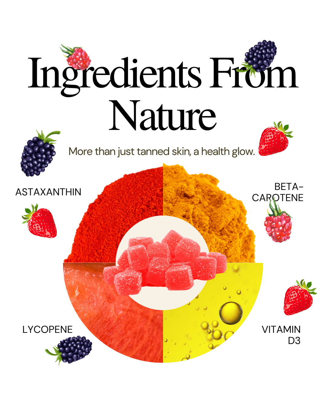 Our gummies contain Astaxanthin, Beta-Carotene & Lycopene, all of which are supplements that have been scientifically proven to darken the skin and increase tanning when supplemented into your diet daily.